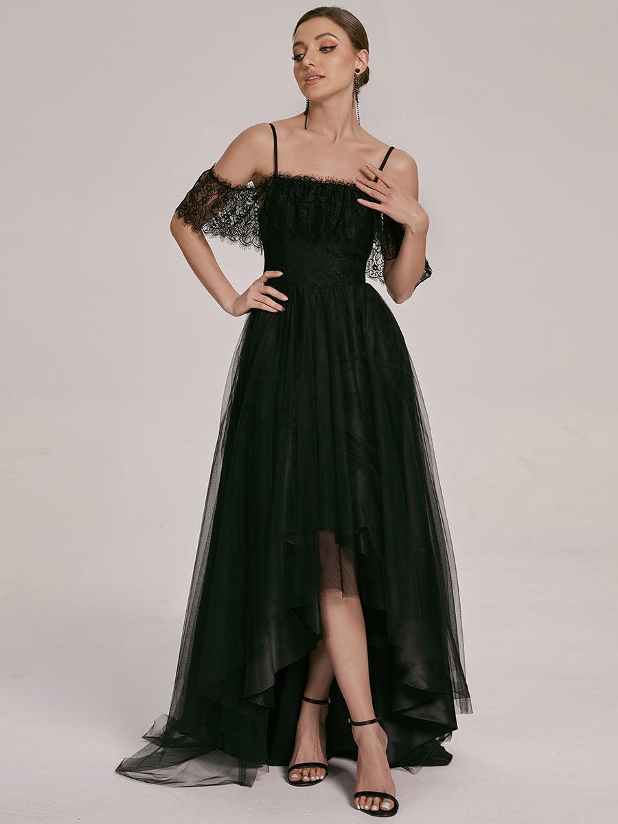 Celebrate your most momentous occasion with this lace high-low wedding dress featuring an easy-to-wear high-low hem, cinched waist, and summery cold shoulder spaghetti strap top. Wear this vintage-style lace high-low wedding dress with your favorite heels of choice for an indoor or outdoor wedding.