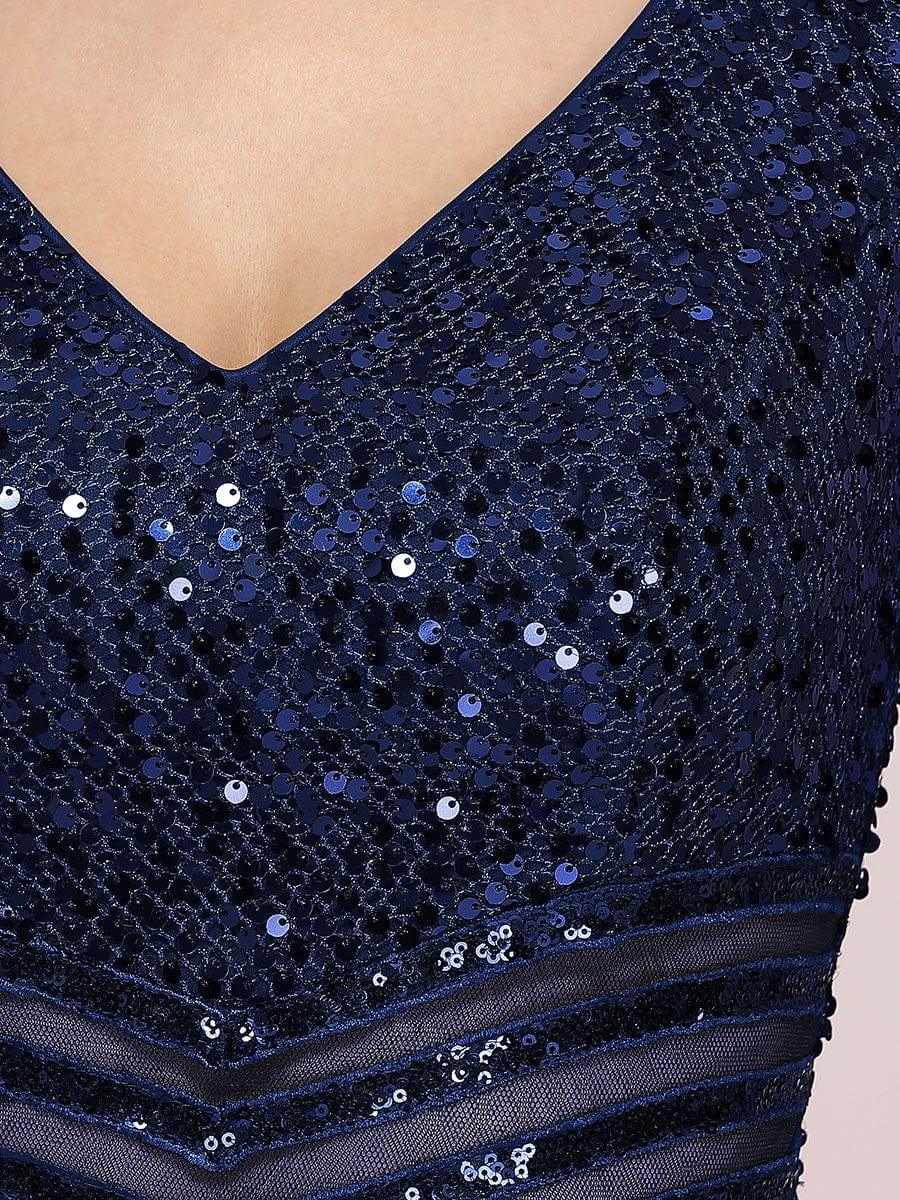 Hold your hearts because this stunning evening dress would make you look like a princess. This plus size evening dress for mature woman features a deep V-neck and is sleeveless. The A-line silhouette of the dress makes it look high-end and fabulous. The paillette designing on the upper body looks stunning as well. This gorgeous dress is perfect for all formal occasions, from evening party, cocktail, weddings to prom, homecoming and graduation!