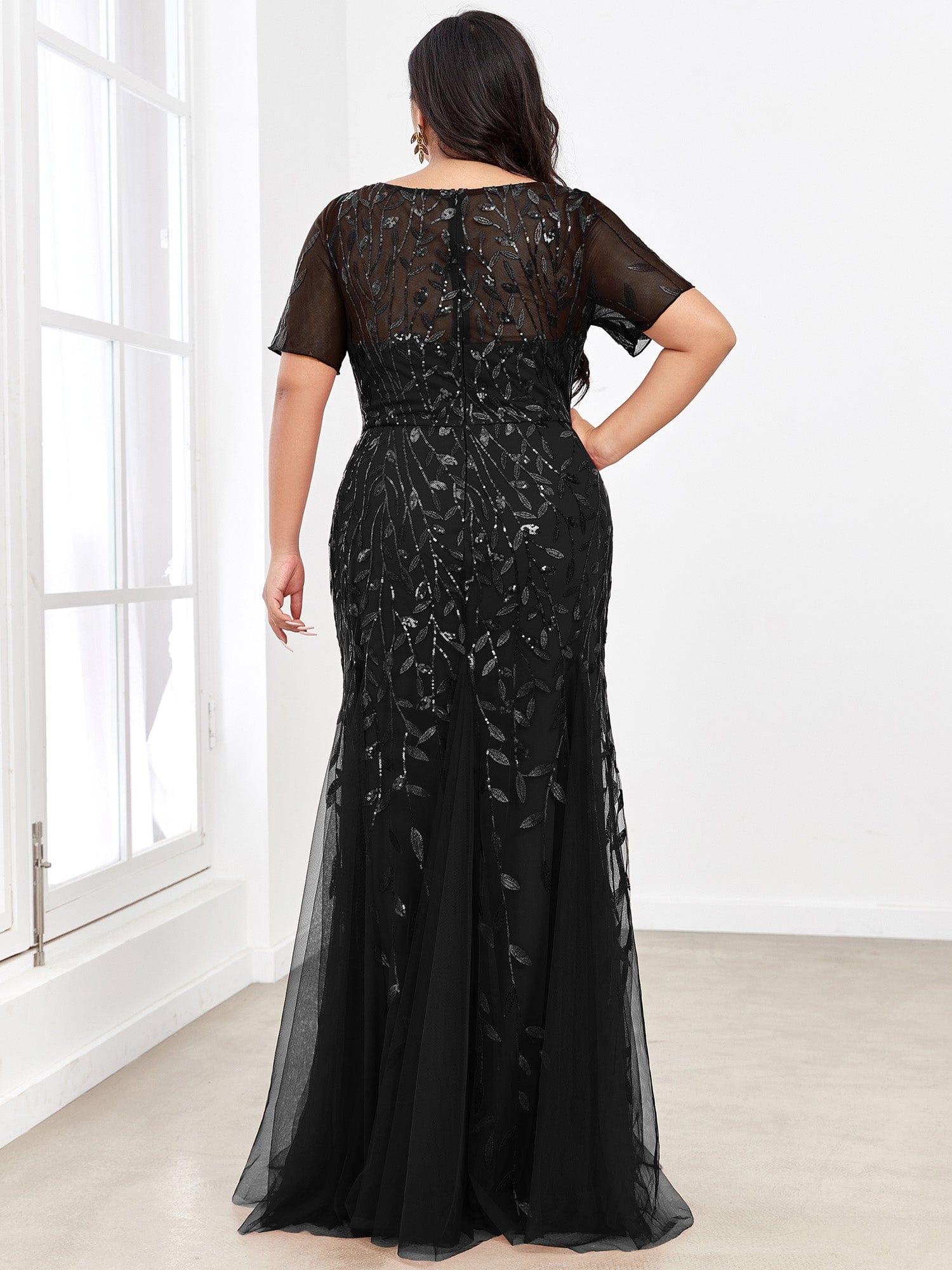 This plus size sequined tulle evening dress oozes romance with its shimmery leave design and a sheer round neckline. This plus size tulle dress is a perfect choice for people who are looking for an elegant look, but its delicate details add just enough flair to show your taste. It's perfect for evening party, cocktail, prom, homecoming, graduation, weddings, and any other formal affair!