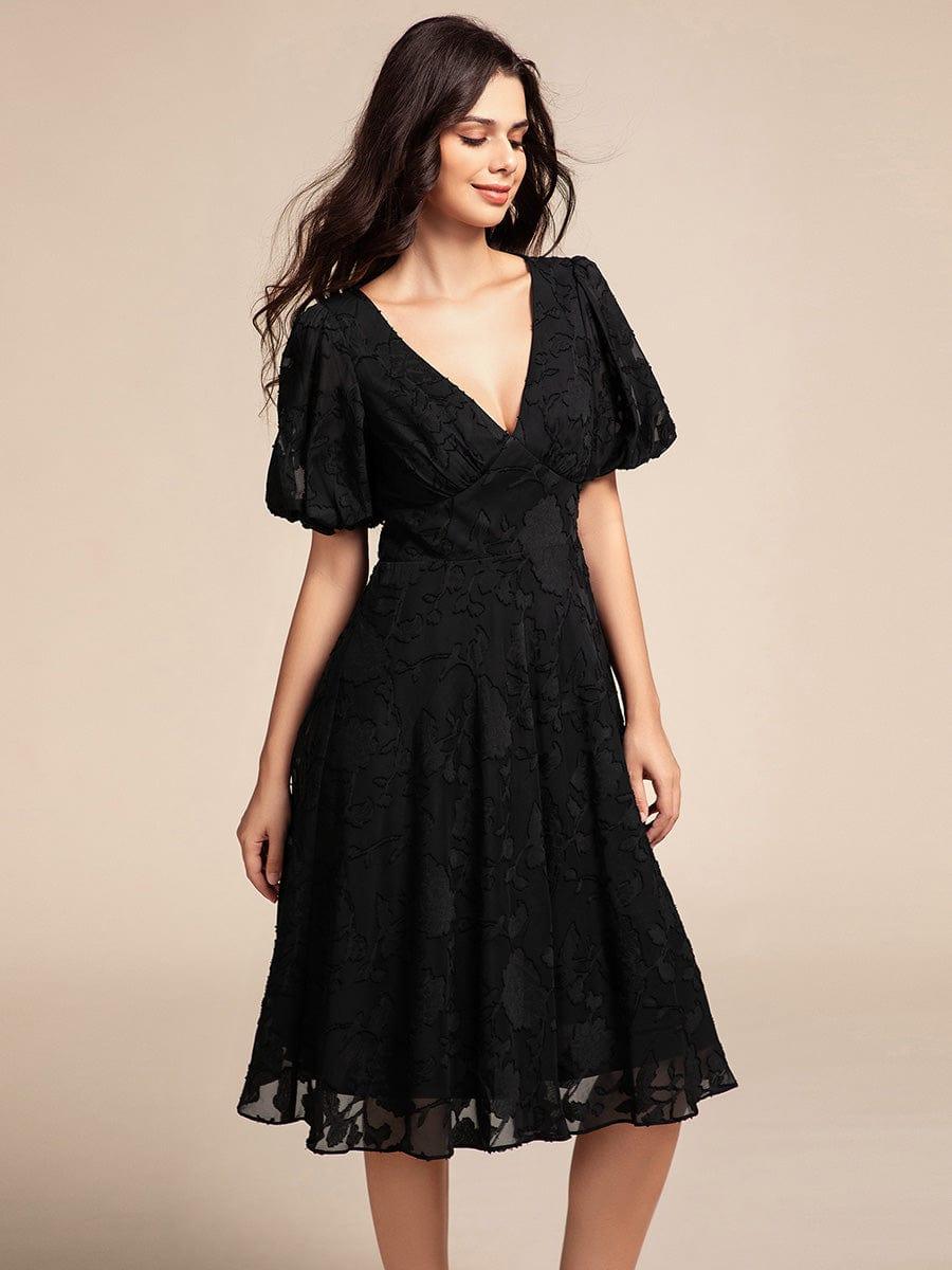 ever DANI|Puff Sleeve V-Neck Midi Wedding Guest Dress